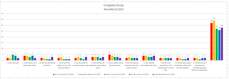 Mr. Blue and Ms. Purple were doing wonderfully. Ms. Purple’s points decreased by 1 from the previous survey. Ms. Purple has improved with feeling lonely and feeling left out. CNAs have said she is speaking with other residents about starting a group of her own using Coregulation. Ms. Purple feels that the CNAs really care and are helping her more. She is also getting better with using her smartphone and she is proud of that.