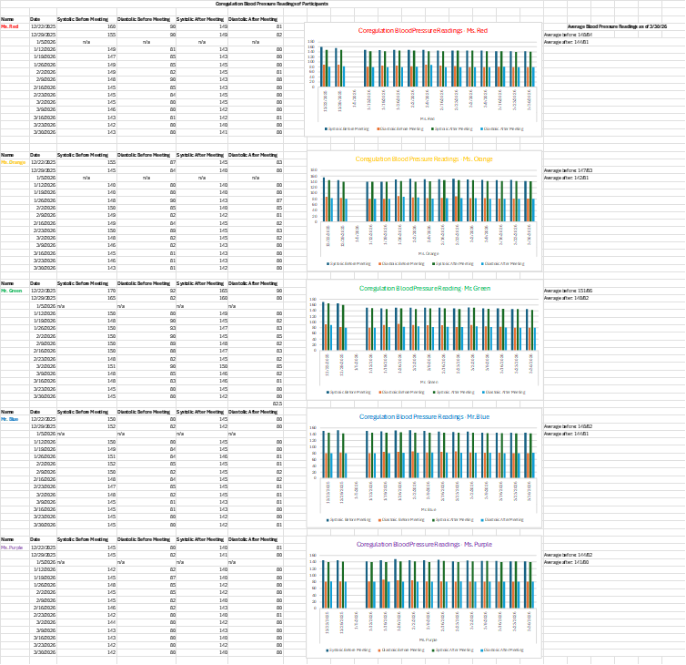 CEPH 9 is being met by storing, organizing, and archiving information in an Excel spreadsheet to document survey responses, blood pressure readings, and meeting notes. Information from the participants has been documented to reflect how the use of Coregulation is affecting the participants. The participants have expressed that they enjoy meeting individually rather than in a group setting. Group meetings have started and have been conducted with two participants: Ms. Purple and Mr. Blue.