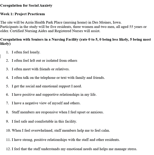 Once the project is completed, artifacts will be provided to show that all competencies have been met. Since part of this project is performed virtually, weekly meetings will be held with Dr. Metcalf via Zoom. In these weekly meetings, discussions will focus on data collection, participants’ meetings, and the steps to take going forward. The meetings will be a time to ask and answer questions about the project's progress. Coregulation training materials will be obtained from the Coregulation Health Institute website. Microsoft Word and Excel will be used to document survey findings, including graphs and charts. The surveys will include data measuring participants’ progress while using Coregulation. Blood pressure readings will be taken before and after the meetings to measure how Coregulation affects the body. Weekly in-person meetings with the participants will entail a detailed plan for this group, along with integrating cultural awareness and promotion. A written report will be prepared showing how Coregulation affected the participants in the nursing care facility. The report will have evidence from surveys, interviews, meetings, notes, and peer-reviewed references. The report will reveal how participants’ social interactions have improved, thereby enhancing their health and well-being.